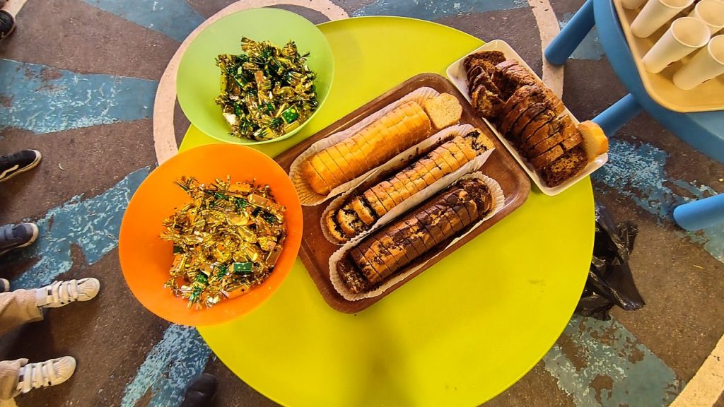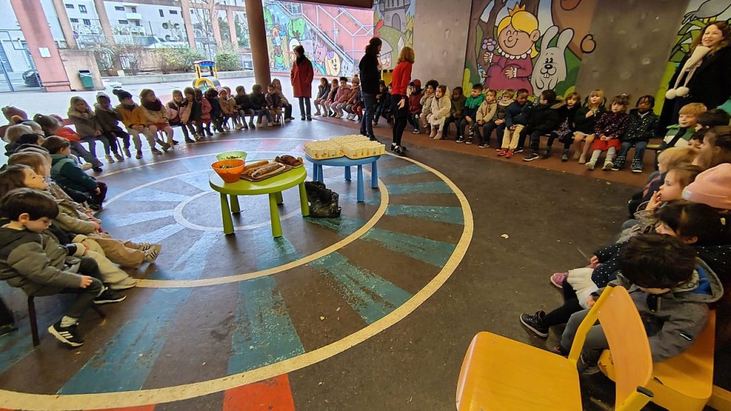 Pour le dernier jour de classe avant les vacances, toute la maternelle a participé à un grand goûter de Noël. Chaque élève a eu une part de gâteau, une papillote et un verre de jus de fruit, et tout le monde a chanté des chants de Noël. C’était un moment très convivial !